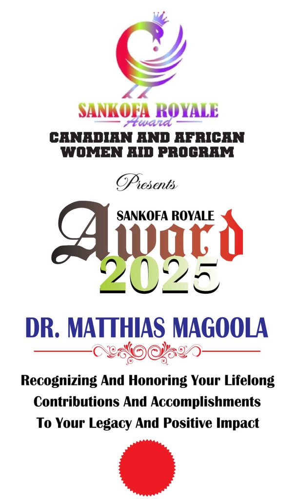 The prestigious award, presented by the Canadian and African Women Aid Program (CAWAP) at Unifor Local, 23 Regan Road, recognized Dr. Magoola’s significant contributions to science, health, and his community.